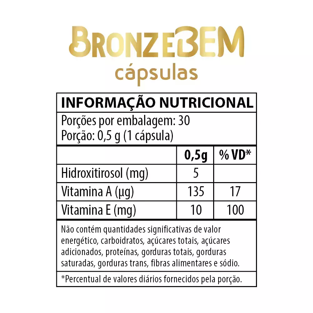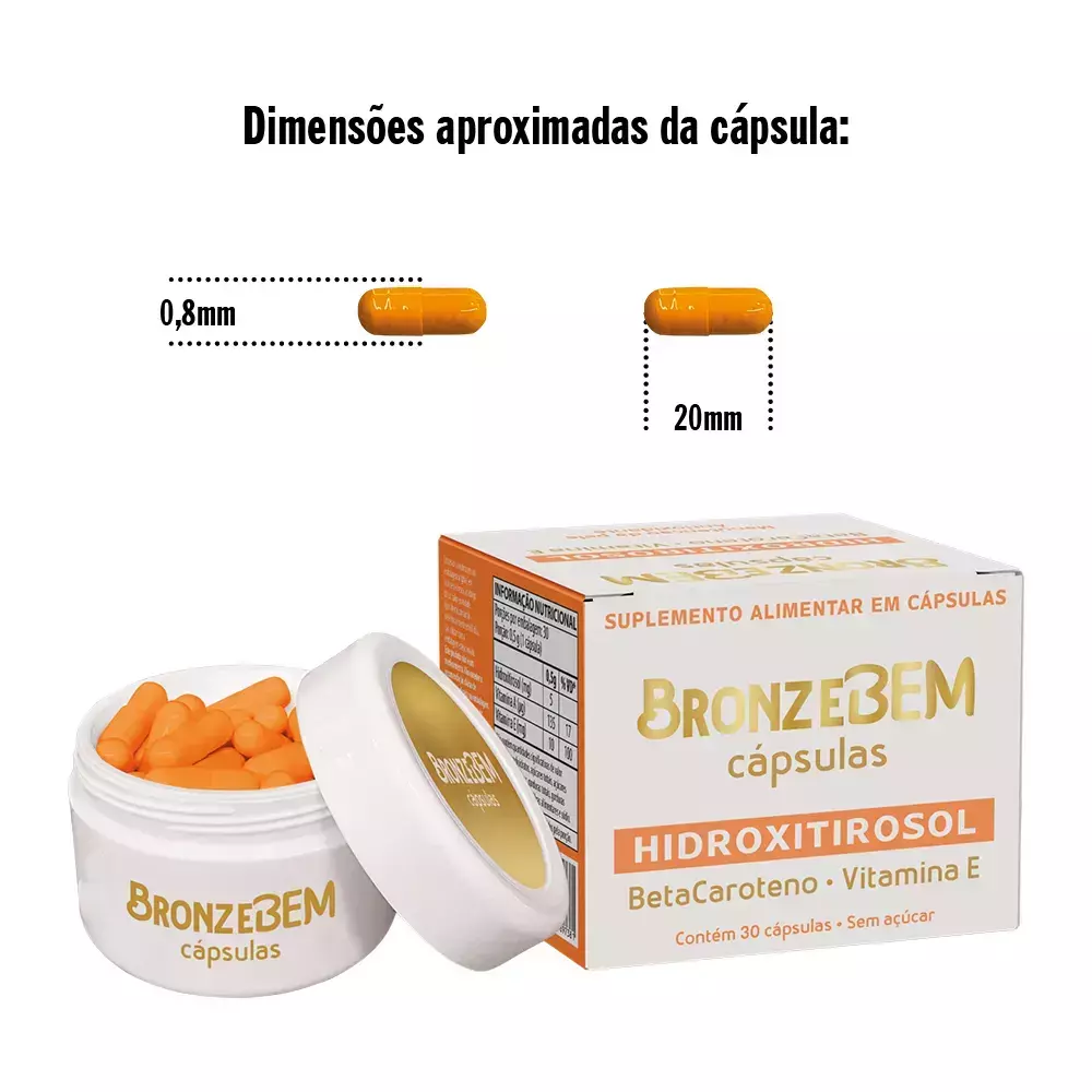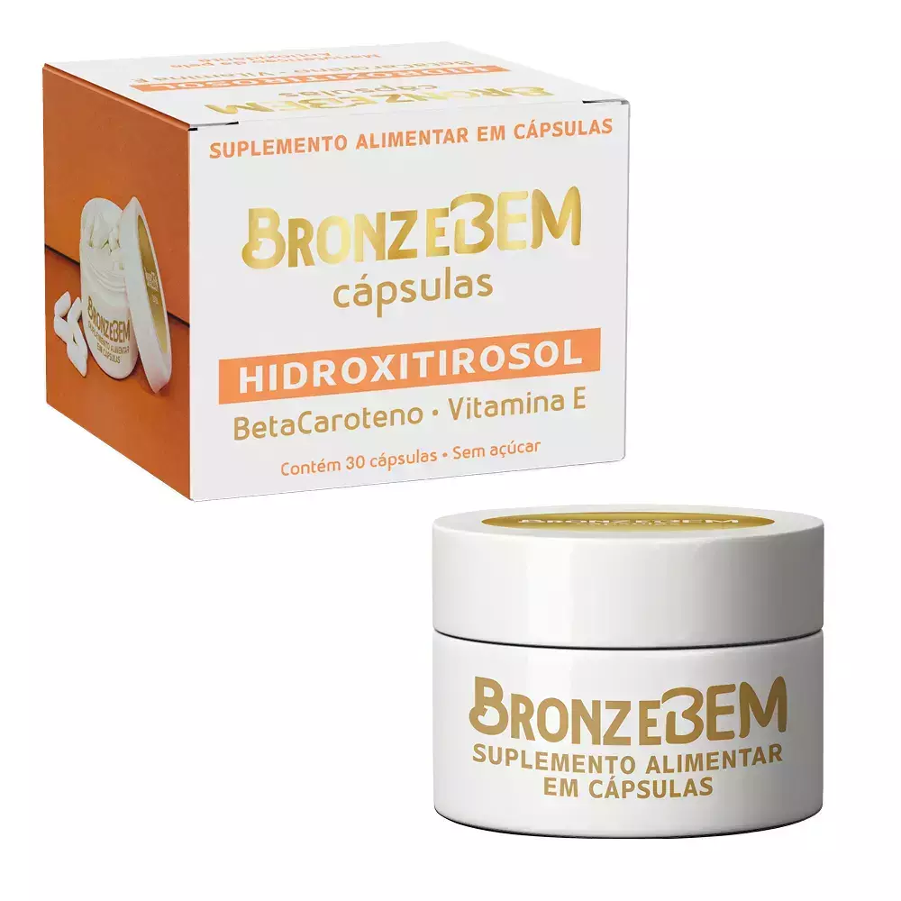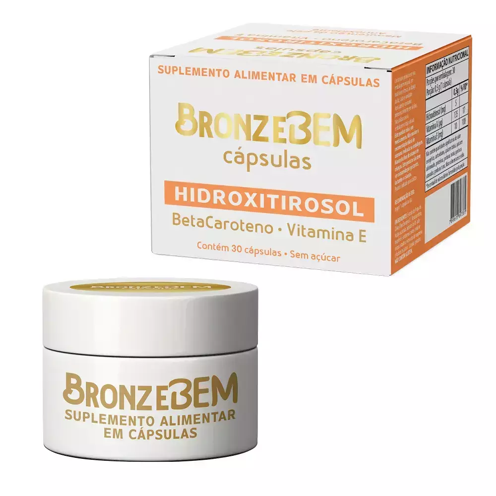 O Suplemento Alimentar de Hidroxitirosol, Betacaroteno e Vitamina E da Bronze Bem foi desenvolvido para apoiar a saúde da pele durante a exposição solar. Sua fórmula reúne antioxidantes que auxiliam na proteção contra os radicais livres, contribuindo para um bronzeado mais uniforme e uma pele com aparência saudável.