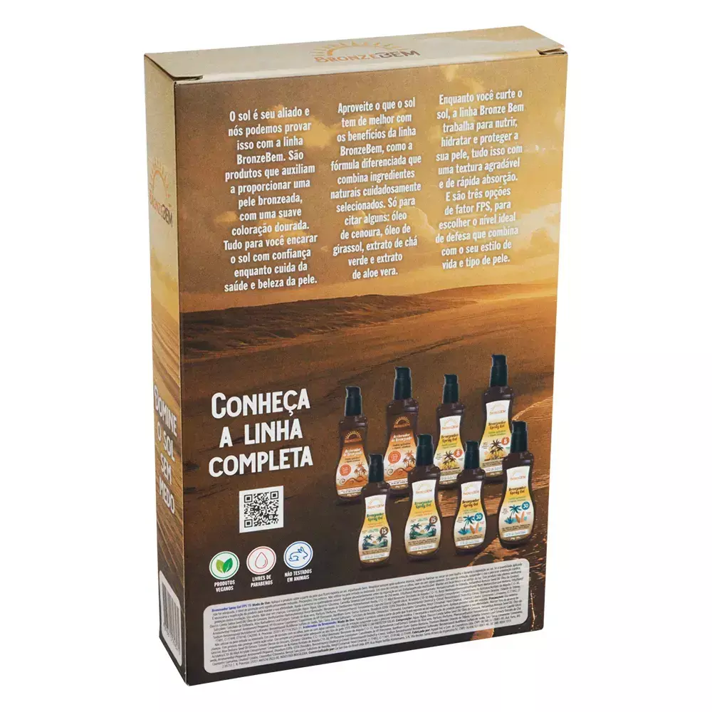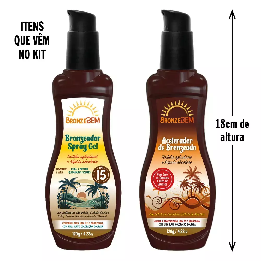 O Kit Bronze Bem foi desenvolvido para quem busca um bronzeado bonito, duradouro e seguro. O Bronzeador em Spray Gel FPS 15 oferece proteção inicial contra os raios solares, enquanto o Acelerador de Bronzeado intensifica o tom natural da pele, proporcionando uma cor mais uniforme e luminosa. Ambos possuem fórmula com chá verde, aloe vera, óleo de cenoura e óleo de girassol, que auxiliam na hidratação e no cuidado da pele durante a exposição solar.