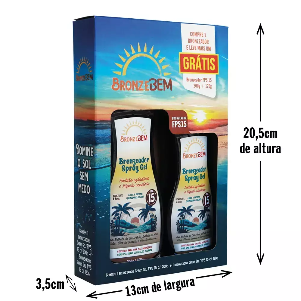 O Kit Bronze Bem FPS 15 foi criado para quem busca um bronzeado bonito e seguro, com a praticidade de dois tamanhos ideais para o dia a dia e viagens. O Bronzeador em Spray Gel FPS 15 oferece proteção inicial contra os raios solares, enquanto realça a cor natural da pele e mantém a hidratação. Sua fórmula é enriquecida com chá verde, aloe vera, óleo de cenoura e óleo de girassol, que auxiliam na nutrição e no cuidado da pele durante a exposição ao sol.