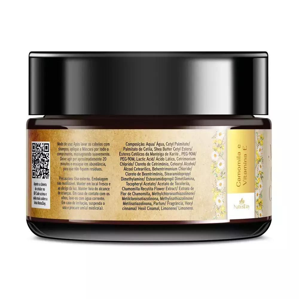 A Máscara Capilar de Camomila com Vitamina E da Natusday foi desenvolvida para nutrir e revitalizar os fios, proporcionando maciez, brilho e aspecto saudável. Sua fórmula combina o extrato de camomila, conhecido por suas propriedades suavizantes e iluminadoras, com a Vitamina E, que auxilia na proteção contra danos externos e fortalece os cabelos.